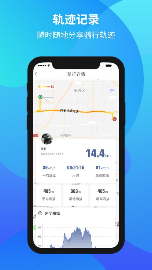 丰富的骑行管理功能,可以自动记录骑行轨迹与骑行速度,骑行结束后,在手机APP上可以查看轨迹路线与速度曲线,也可以分享给好友。