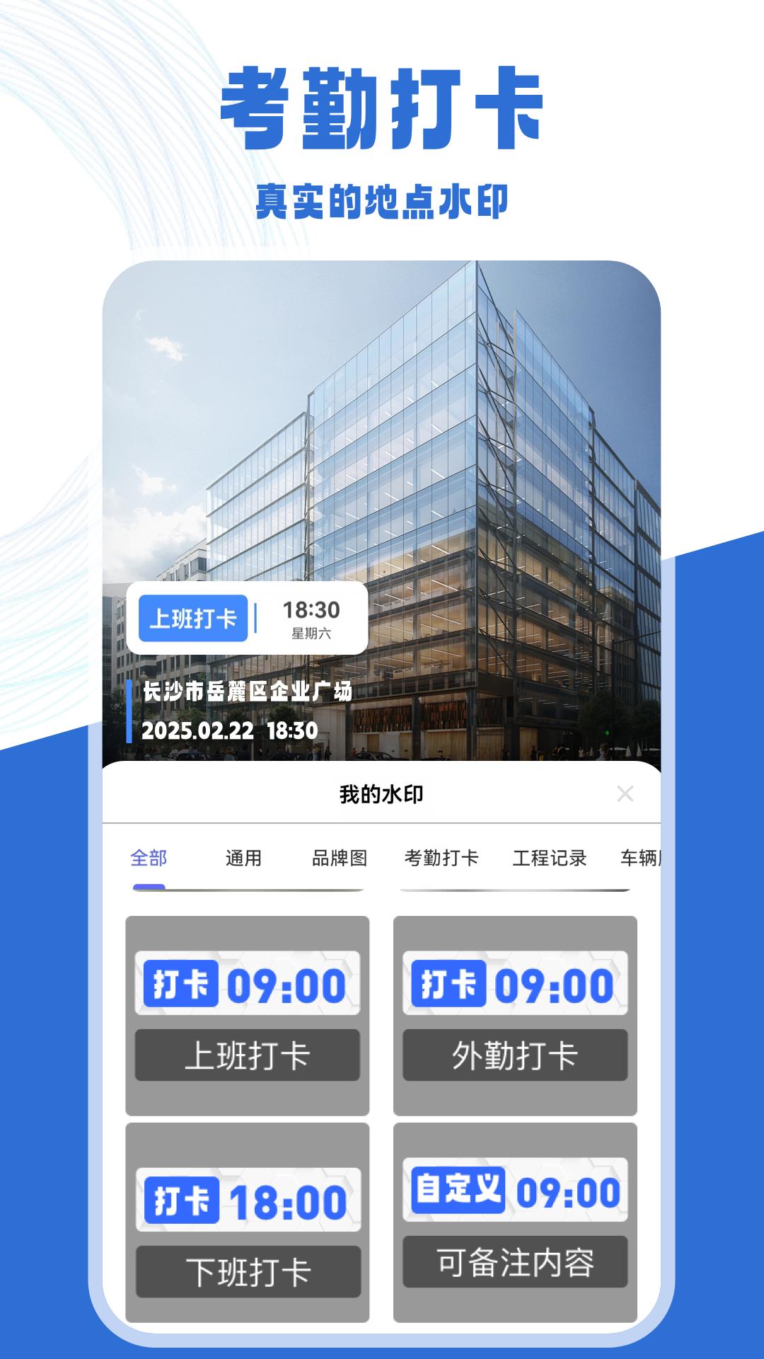 工作时间打卡水印相机支持水印相机定位拍照、批量图片录像加今天水印、快拍水印相机,自定义定位、马克地点、时间、经纬度的自定义水印相机。水印打卡相机添加了工程相机、元道相机、经纬相机、经纬度相机功能,包括:今日打卡水印、工程水印、工程记录、经纬水印、工程记录、海拔相机。微商水印,工程相机水印统统都有!今日时间水印打卡水印相机统统满足你!