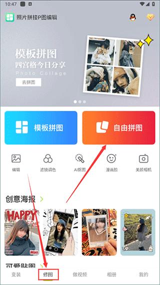 2、在软件下方选择【修图】模块,当前页面我们可以看到【模板拼图】、【自由拼图】等功能;