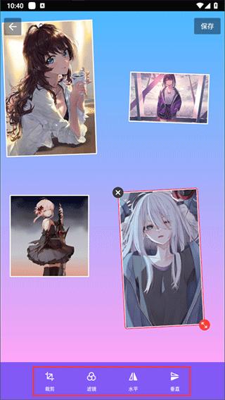4、然后我们就可以自由移动每一个图片的位置了,如果想要编辑图片,也可以单击图片,为其【裁剪】、添加【滤镜】、【水平】或者【垂直】反转等等;