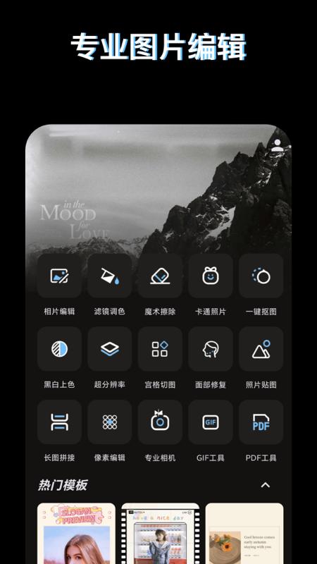专业品质: 采用PS级算法,效果媲美专业修图软件。