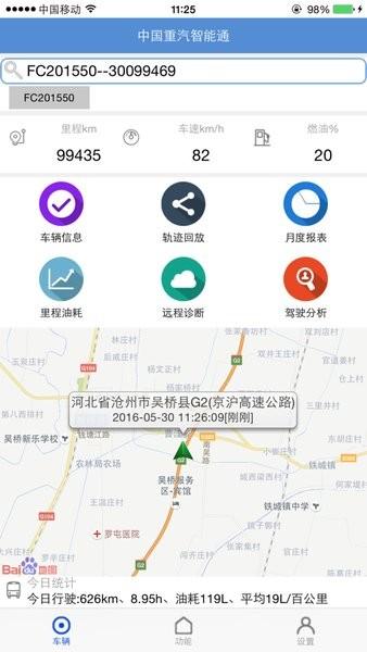 中国重汽智能通平台,是由中国重汽自己研发的车联网服务平台。中国重型汽车集团有限公司技术发展中心官方推出,软件拥有位置,诊断,状态等等功能服务,可以帮助更好的车辆服务。