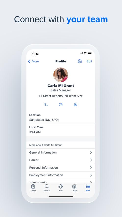 • 查看员工资料并直接给他们打电话、发短信或发送电子邮件。