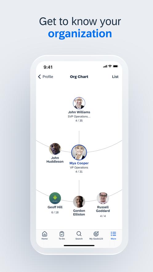 • 查看公司的组织结构图,了解每个人的联系方式,包括直接下属、矩阵报告和新员工。