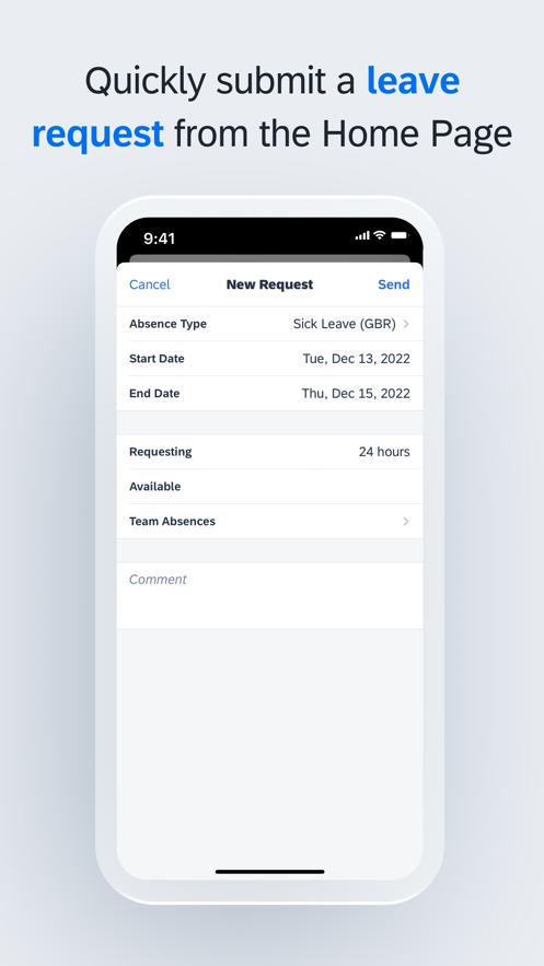• 查看您的休假时间,向您的经理提交休假请求,并让同事知道您何时休假。