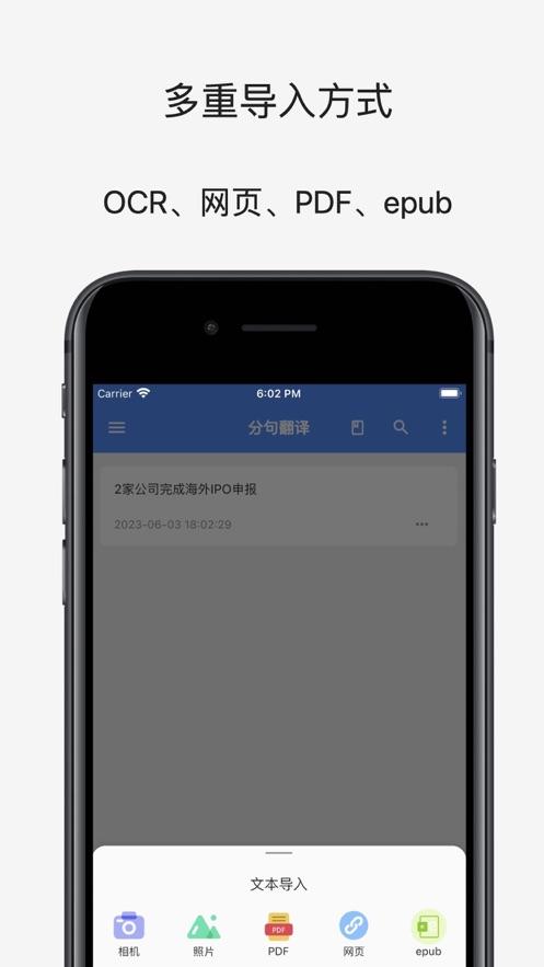 分句翻译—双语阅读小工具app是一款手机翻译软件,软件可以通过多种方式导入文本,拥有文章收藏,富文本笔记功能,并且软件内置多种翻译引擎,可以帮助更好的手机翻译。