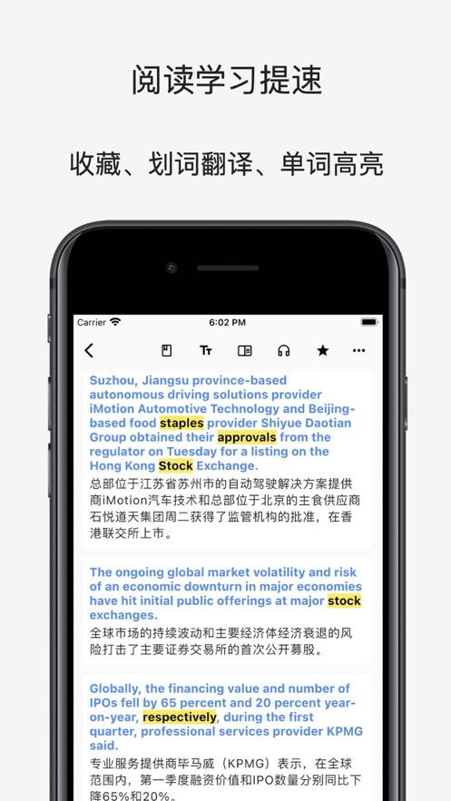 阅读时支持长按划词翻译或单击单词翻译,会员支持单词收藏以及高亮显示。