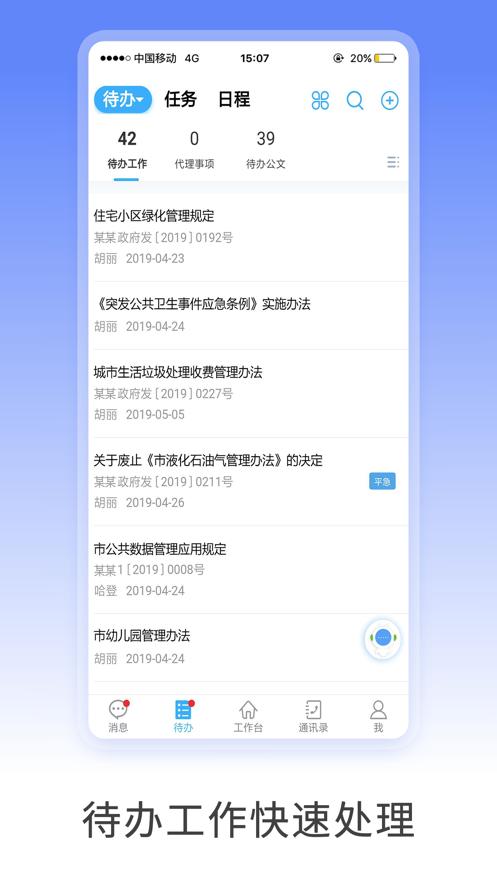 移动政务app下载是一款政务工作移动平台,平台拥有消息,待办,工作台,通讯录,我的等等功能服务,可以帮助更智慧高效政务工作。