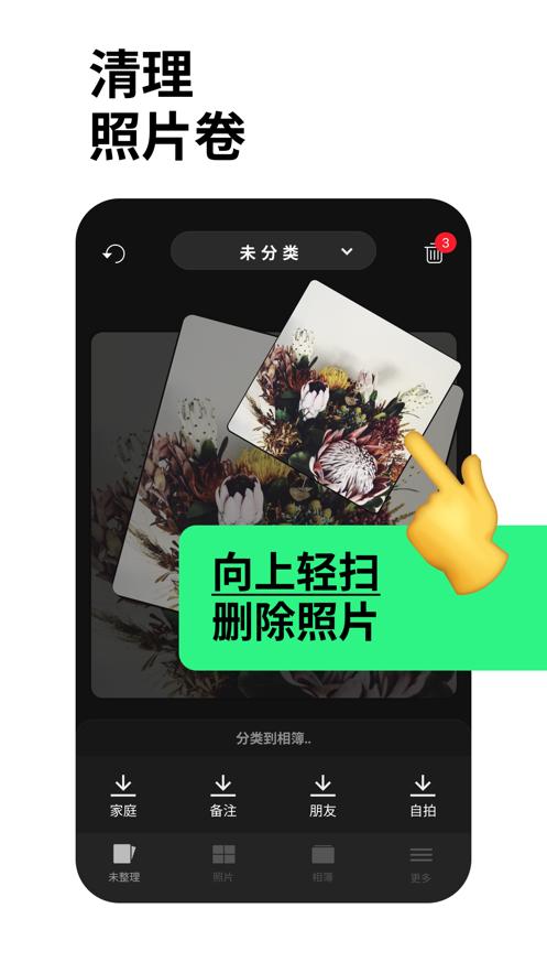 全屏滚动浏览照片并向上滑动以删除不需要的照片或选择要分类的相册。比较相似/重复的照片,并通过滑动快速删除它们。就这么简单。