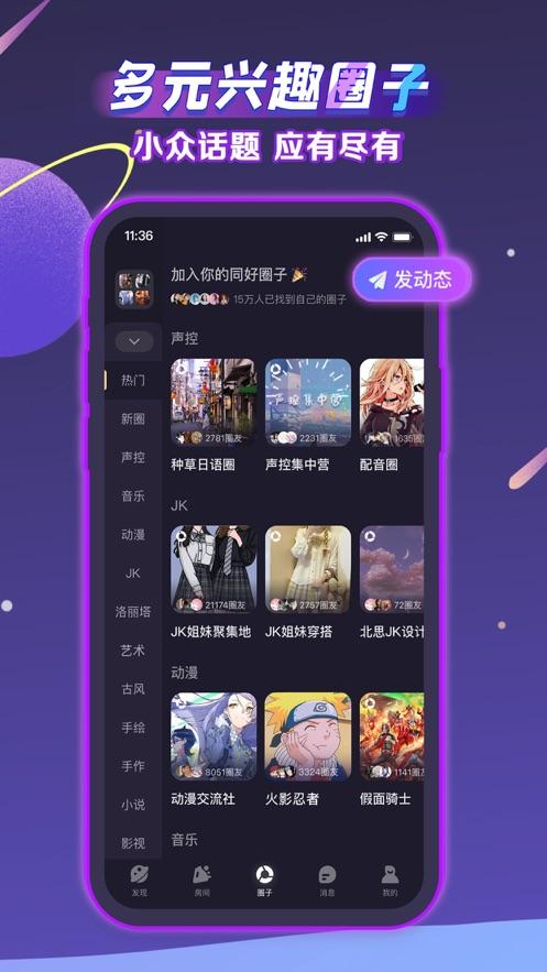 一款主打用声音交友,用声音记录生活的社交软件。在“找朋友”中,不再以颜值为判断标准,以声音为切入点,通过声音内容了解结识心意相通的知交好友。大家在“一起玩”中,以声会友用声音破冰,特别是房间里的9麦模式,可以实现多人实时在线语音聊天,充分地满足大家自我表达的诉求。并且每个人都可以发言,都机会通过去表达自己、同时了解他人,从而形成朋友,拓宽自己社交渠道。当然你也可以根据自己的爱好,在“派圈”中寻找自己喜欢的话题开启一场声音派对,畅所欲言,解放自己的真实个性。