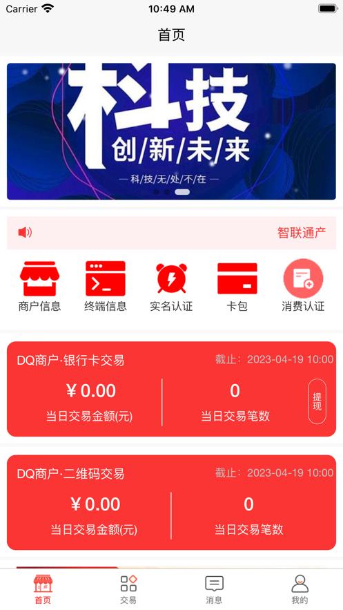 智联通app是河南涡轮信息科技有限公司倾情推出,软件拥有首页,交易,消息,我的等等功能板块,可以帮助更好的经营管理,欢迎前来下载使用。