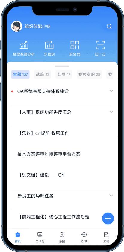 乐协作app是专为乐信集团制作的一款移动办公软件,软件拥有首页,工作台,乐圈,OKR,文档等等丰富功能,是用户移动协同高效工作的掌上好帮手。