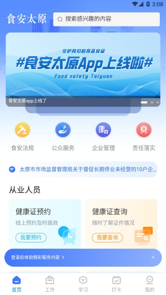 食安太原app是一款食品安全移动服务平台,平台拥有首页,工作,学习,打卡,我的等等功能板块,可以更好的保护食品安全,需要的朋友欢迎前来下载使用。