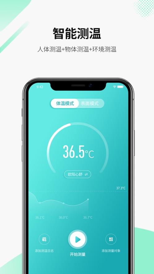 APP通过手机蓝牙功能与外部智能温度模块通讯,可用于体温测量和物体表面温度测量,并记录统计历史温度,可应用于学校、医院、社区、家里等。