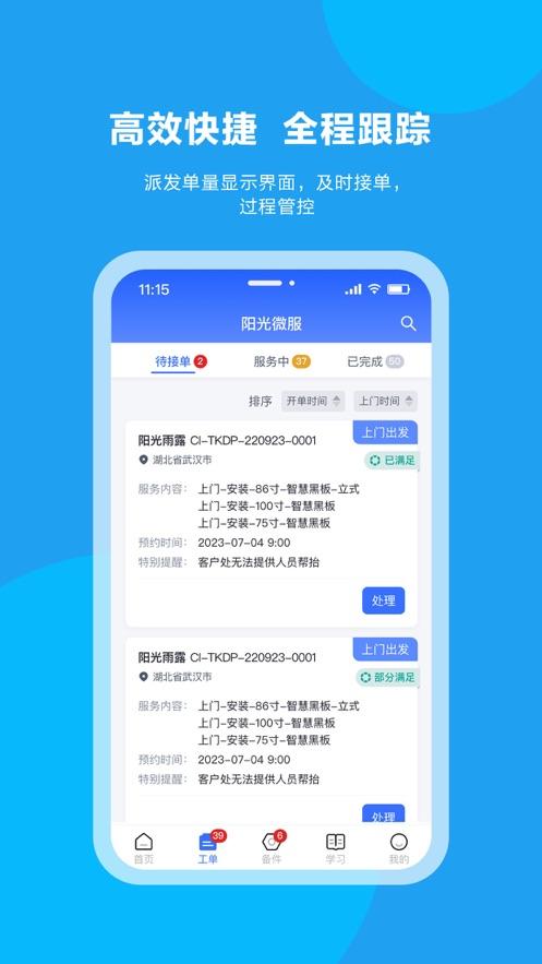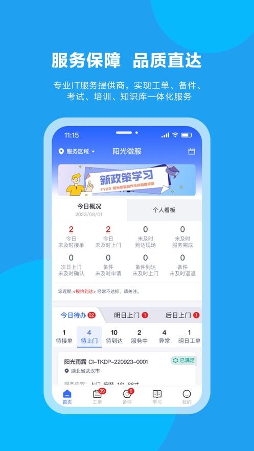 阳光微服app是专为广大技术工程师制作,软件实名认证,拥有海量订单资源,还可以在线备件,学习等等,可以帮助用户更好的赚钱。