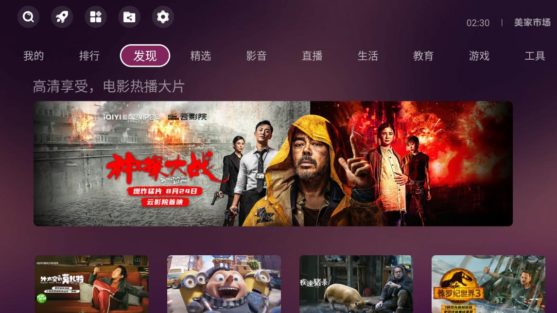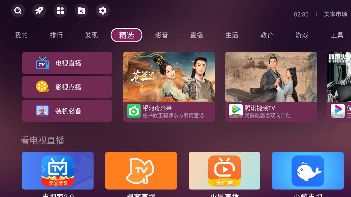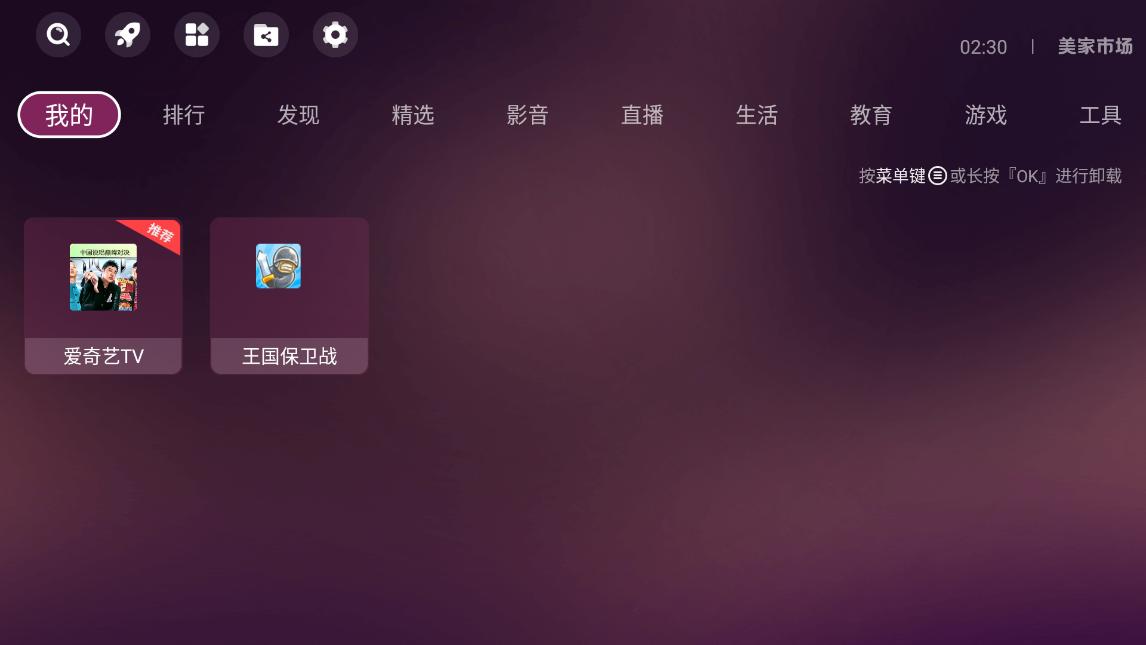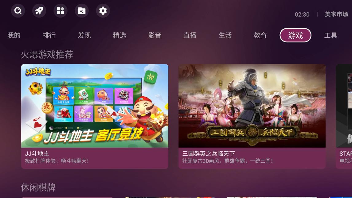 美家市场是一款专为智慧大屏终端打造的应用商店,在这里可以在这里可以看电视直播、玩大屏游戏、上名师课堂、跳动感热舞、听音乐戏曲,陪你一起探索电视的乐趣!