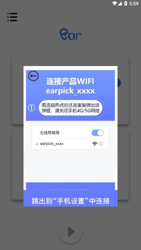 确认机器是否已开机,产品指示灯常亮表示已开机,下载app后,检查是否有earpick_xxxx开头得热点名称。