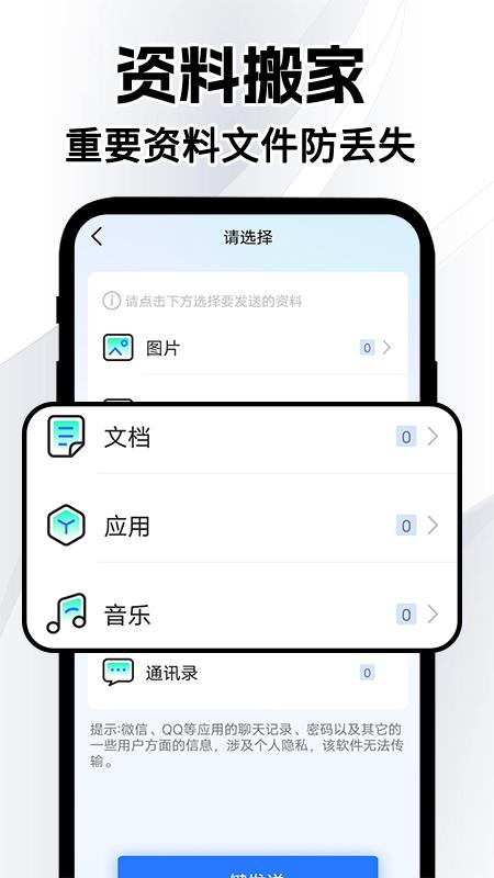 选择重要的资料文件就可以一键发送出去,轻松进行文件传输,对其资料搬家。
