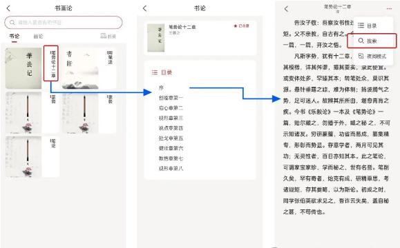 您可阅读书论、画论文章/书籍,点击右上角收藏,保留历史阅读记录和阅读进度;您可在书目搜索页面搜索所需书名;点击页面任何一处可切换至下一章;进入正文页面,点击右上角可切换目录或搜索正文内容,也可以按需切换夜间模式。