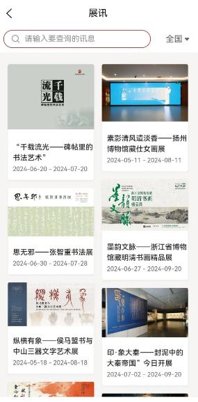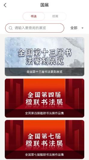 浏览全国书法、绘画展览,书法展可按类型筛选,查看展览特邀作品、评委作品、入展作品以及获奖作品等。