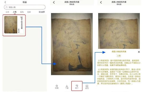 查看画的详情:可收藏、下载绘画作品,原图/全图展示切换,点击「简介」可查看画的详细信息。