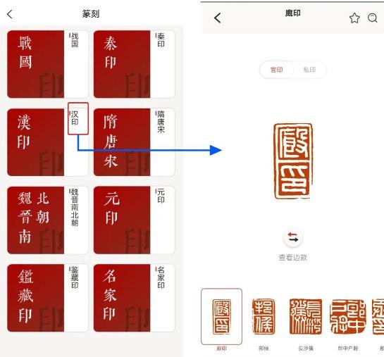 通过朝代分类查看印章图案,可在印章类型中按印章名称进行搜索,有边款的可查看印章边款。