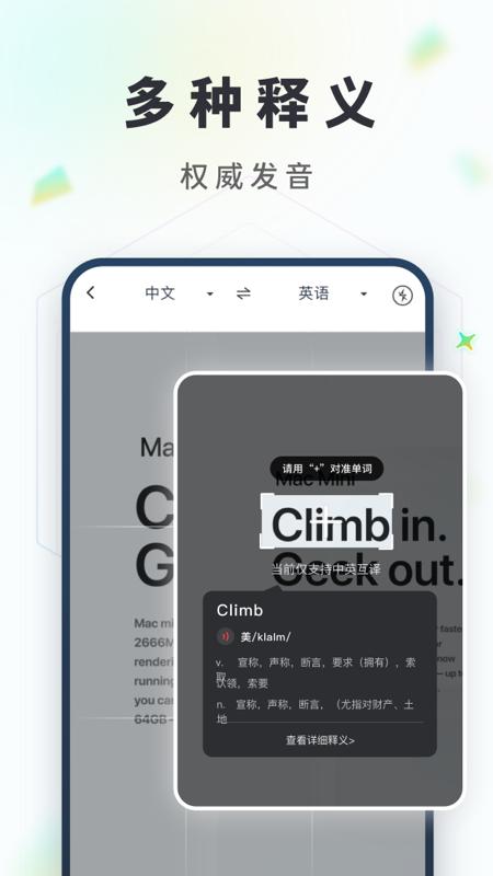 ● 拍照翻译:快速识别图片文字,一键转换成译文。