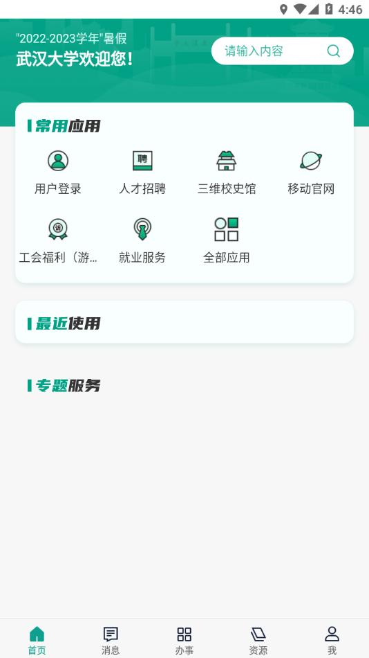 1、首页包括移动官网、新闻通知、珞珈e卡、掌上悦读、电话黄页及办事大厅等六大常用功能,底部又分为“首页”“消息”、“办事”、“资源”和“我”五类选项