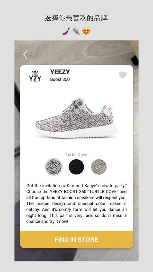 2、Wanna Kicks官方版通过AR增强现实技术与智能手机相机的结合,帮助你看到YEEZYBOOST350等运动鞋「穿」在自己脚上的效果。