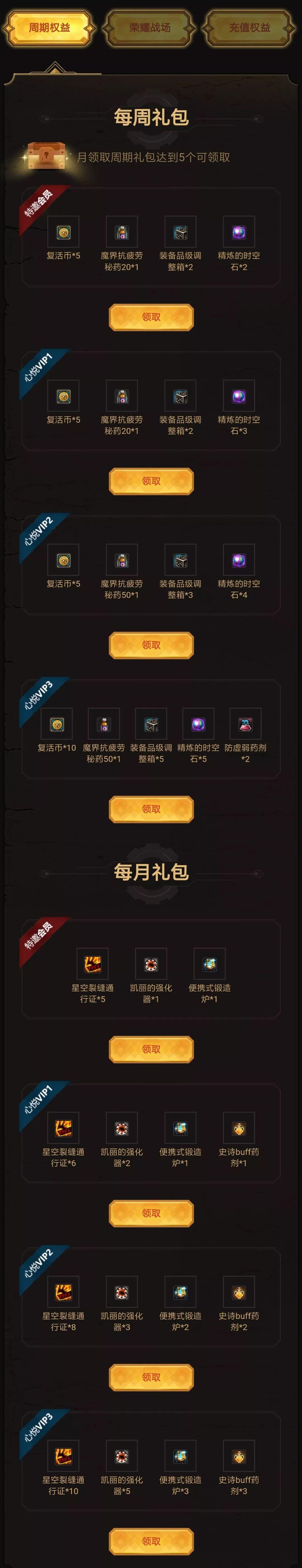 五、进入荣耀战场后,如果你是特邀玩家(一年内充值500元及以上)或者心悦玩家(成长值50000以上,1元=10成长值),那么可以先把周期权益的每周礼包和每月礼包领了。