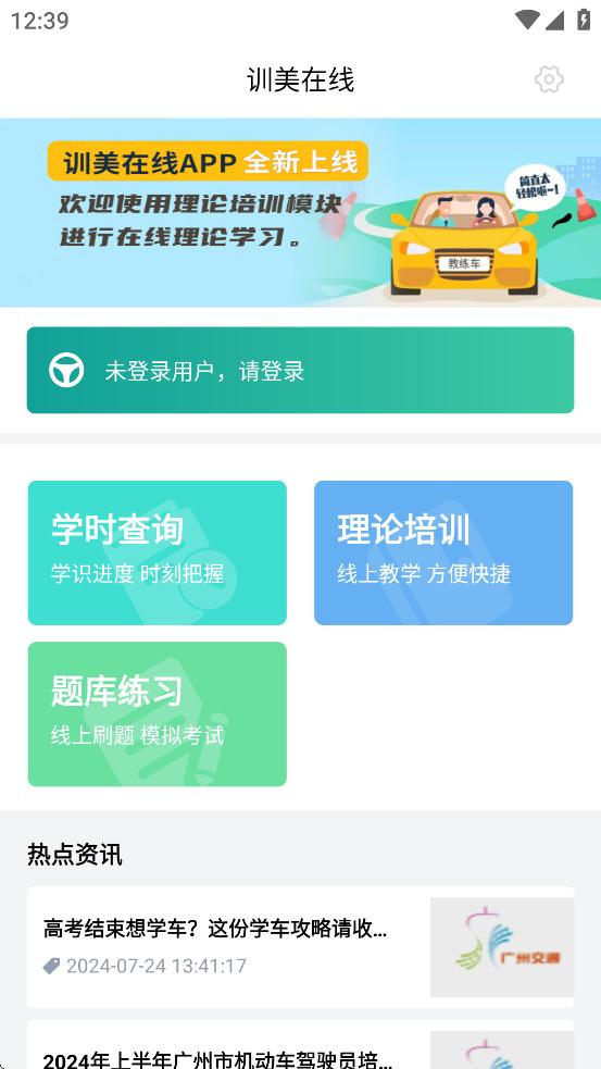 训美在线App为机动车驾驶培训学员提供远程在线理论培训、培训学时查询、行业热点资讯等学车服务,