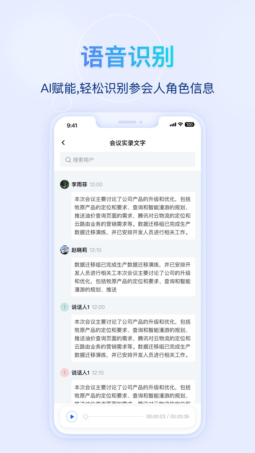 1、实时转写:无需专人记录,会中实时听会转写,提炼会议当前议程下的讨论内容,随时浏览会议重点。