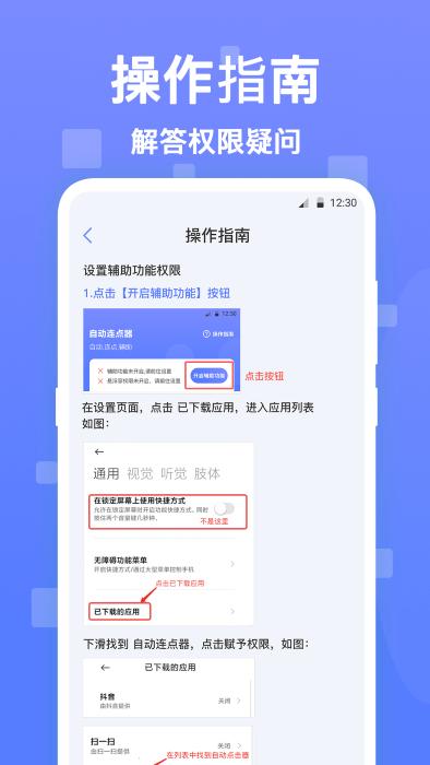 1、可以帮助用户自动点击手机屏幕上的任意位置。