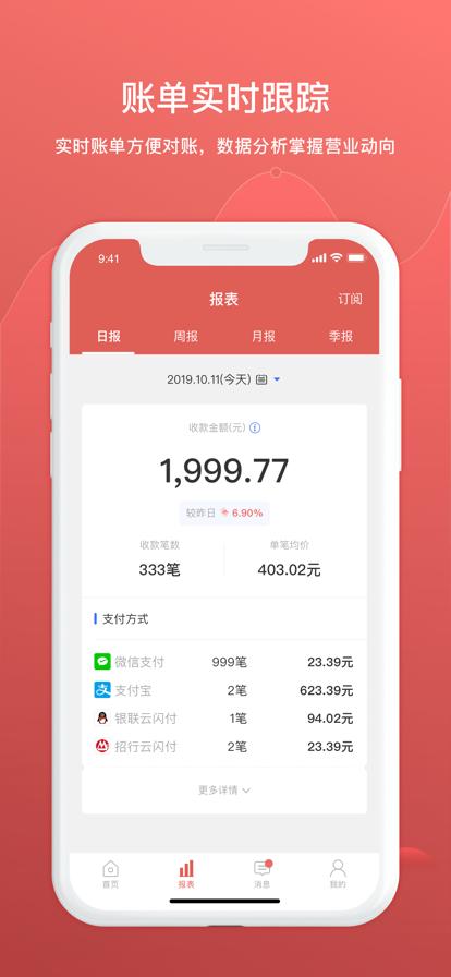 【收款】商户可快速开通多种移动支付收单方式,支持消费者扫码支付、刷卡支付,收款便捷;