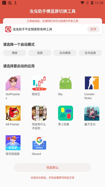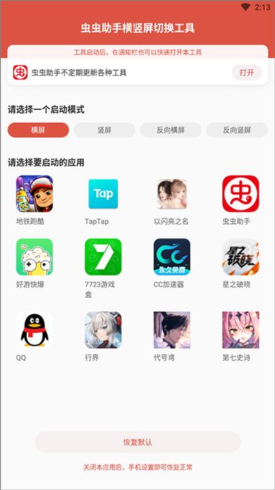 1、打开虫虫助手横竖屏切换工具,选择启动模式,支持横屏、竖屏、反向横屏、反向竖屏;