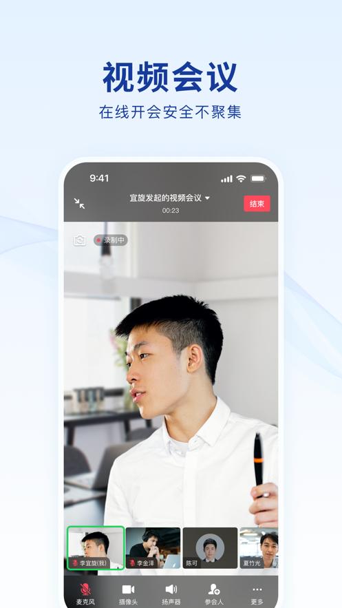 组织通讯录、即时通讯、企业云盘、电话会议、视频会议、线上直播、公众号、开放平台、重点应用;