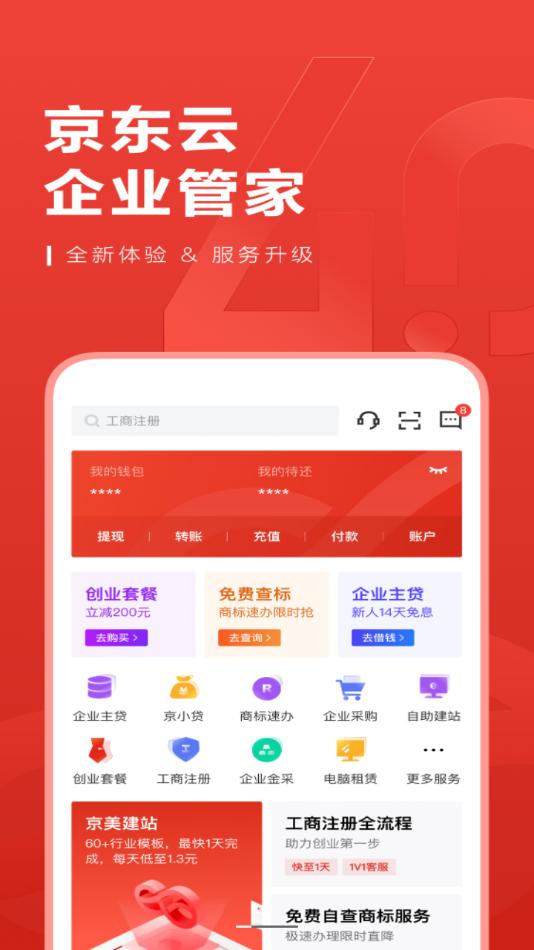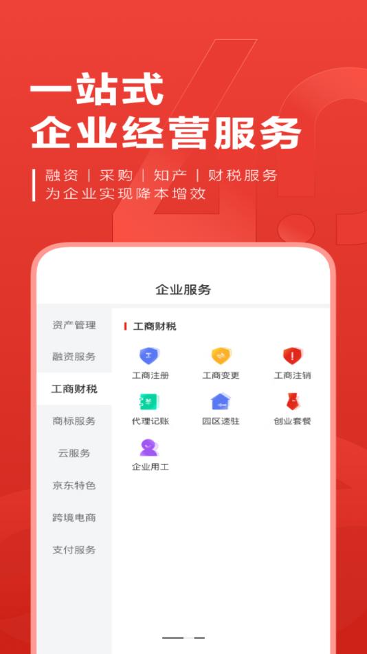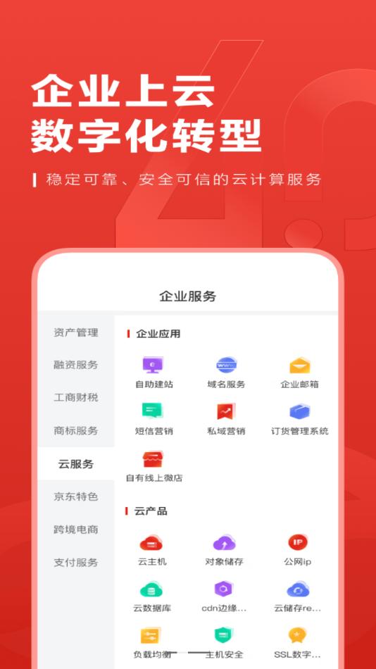 京东云企业管家app是一款中小企业移动服务平台,平台拥有云计算服务,工商财税,商标知产,跨境服务,企业采购等等丰富功能,是企业经营管理好帮手。