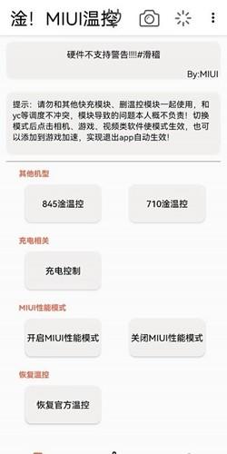 淦MIUI温控是一款专门为miui系统打造的手机系统控温软件,该软件能对手机进行智能温控调节,大大的解决了用户在使用手机时出现的发热发烫的问题,淦游戏降温神器能够有效的提高手机的使用寿命。支持5档配置调节,默认剔除高刷机型降亮度,锁帧等问题,可替代温控移除,快充模块等,主页支持855及以上的高通、天玑小米设备免重启切换,支持710、845淦温控,支持Flyme等GSI ROM包。