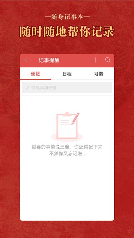 ①随身备忘录:每日宜忌的记事功能,轻松安排日程。