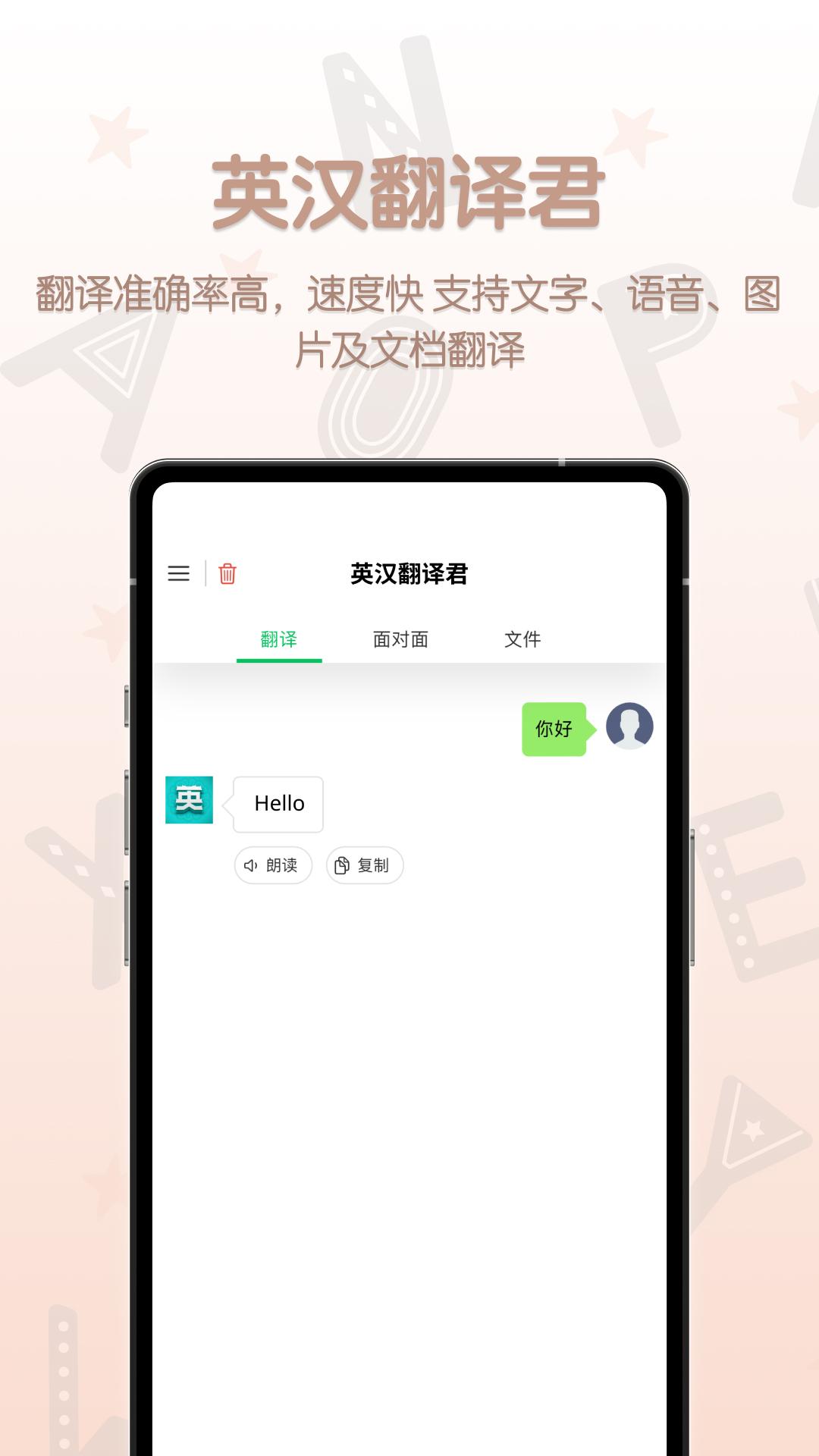 英汉翻译君最新版是一款非常好用的英语翻译工具软件,这款软件可以帮助大家轻松来翻译英语内容,软件拥有多种反应方式供大家免费使用,包括了:语音翻译、图片翻译、拍照翻译、面对面翻译、文件翻译 (Word, PDF, Excel, Txt) 翻译等等,有需要的小伙伴快下载使用起来吧。