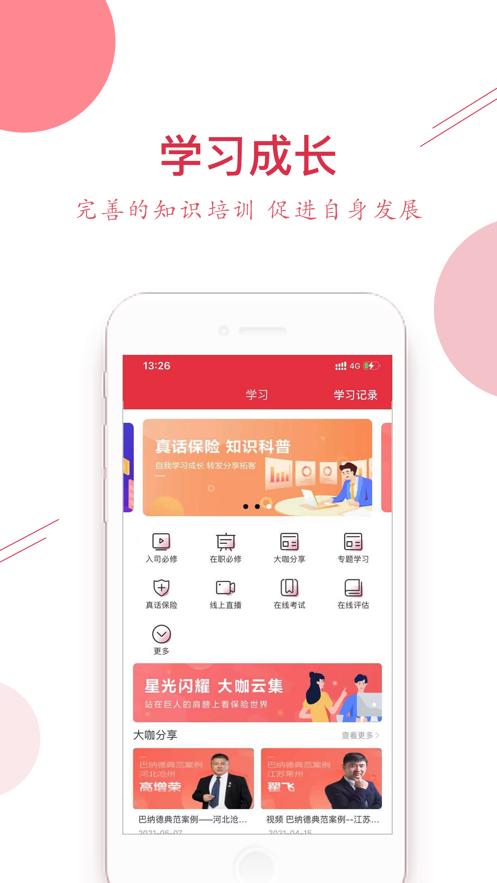 形成碎片化的学习时间和灵活机动的培训体系。提供保险学习资料/产品资料/成长课程等,根据用户所处职级/阶段进行培训课程推送提醒,完成会有相应积分奖励,提高学习主动性;利用直播功能,打造优秀直播明星,根据业务节奏,推出业绩榜样,提高荣誉感和归属感;邀请专业人士,如理赔核保资产等定期进行直播分享,专业知识一线触达。