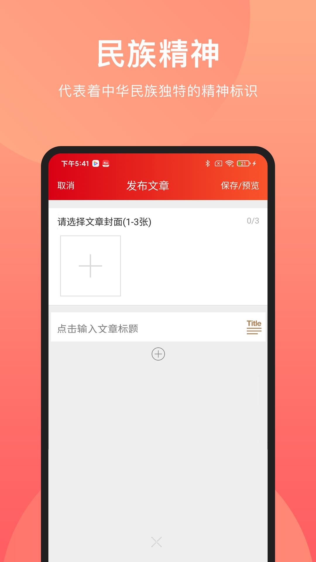 民族精神我辈扬安卓版是一款很好弘扬红色精神,了解民族之间的团结的重要性的一款新闻阅读软件,这款软件内没有广告,并且软件内的内容都很红色健康,积极弘扬民族精神,是一款很好用的红色软件,软件不仅可以看红色新闻,还可以自己发布一些内容。