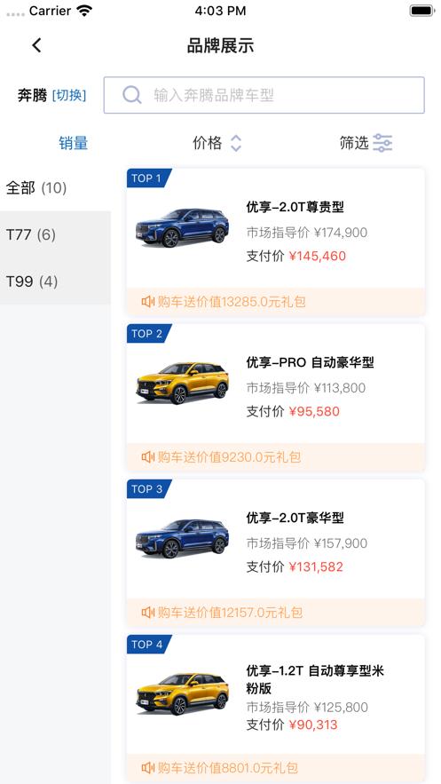 进入应用的客户提供可进行商品购买同时享受相关服务,可全面浏览、分类查看、销量推荐、价格筛选展示车型信息,按需查找设置品牌车型与价格,针对性浏览。车辆详情全面细致,根据车型选颜色,根据颜色反选车型,多方式为购车提供便利。