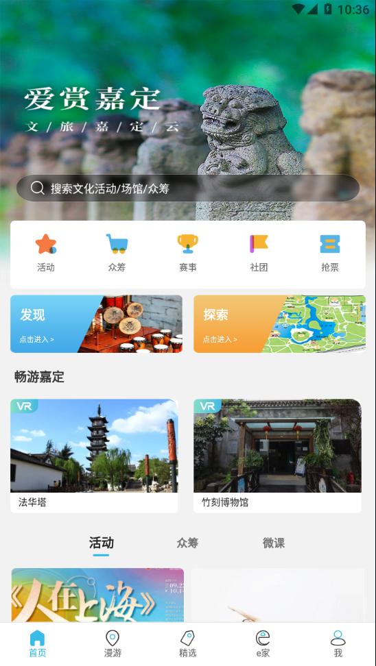 文旅嘉定云app是一款综合式文化旅游活动平台,可以在首页直接搜索文化活动、场馆、众筹等等,具有文化活动、文化众筹、文化赛事、文化场馆、文化社团、文化e家、 网上书房、数字展馆、曲艺荟萃等不同的板块内容。