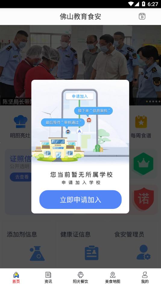 佛山教育食安app下载是专为佛山制作的校园阳光餐饮移动服务平台,平台拥有首页,资讯,阳光餐饮,美食地图,我的等功能服务,需要的朋友欢迎前来下载使用。