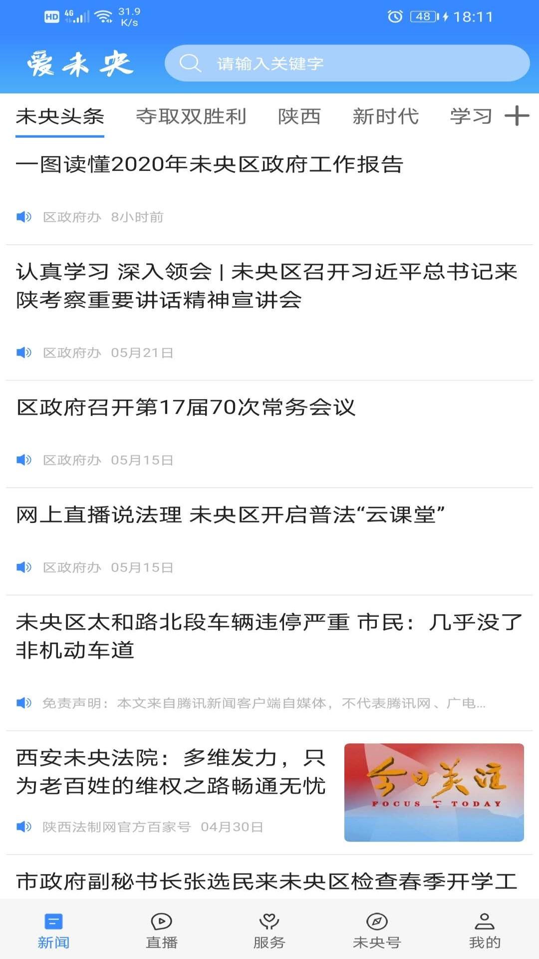 “爱未央”手机APP作为未央区融媒体中心主办的“新闻+政务+服务”综合APP,是权威的舆论宣传主阵地。开设了新闻、直播、服务、“未央号”等栏目,整合了区域内网站、微信、微博、短视频等自媒体和部门、社区、街道政务服务资源。用户可通过客户端,第一时间了解未央政治、经济、民生、服务等方面的新动态,同时提供各种便民服务,还可参与实时互动,实现“一端在手,尽享智慧”。