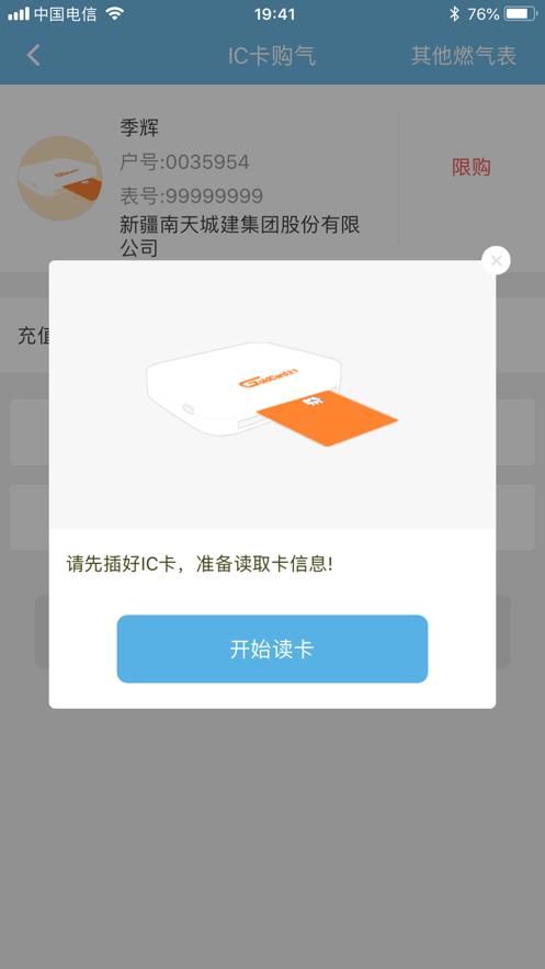 第三步:在读卡页面点击“立即读卡”选项,进入“IC卡购气”页面,输入“充值气量”(单位:方),然后再点击“购气”按钮。