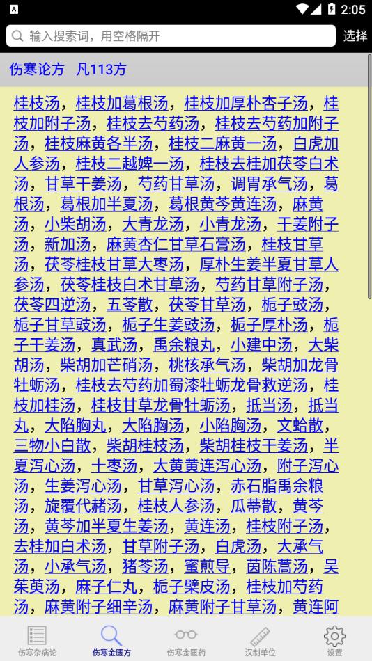 该应用以表格形式展示了伤寒论398条原文及113方内容,以及可选的金匮要略的内容,可以方便的过滤搜索条文以作研究,或者输入数字编号直接滑动到某条条文以作学习,搜索框还支持多关键字查询,只要以空格隔开就可以,