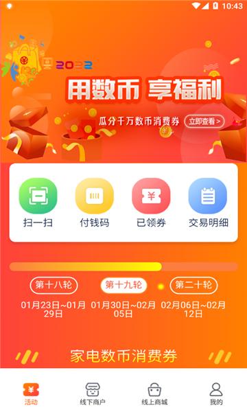 1、根据规则领取家电、家具、商超、餐饮四大场景的数字人民币满减消费券;