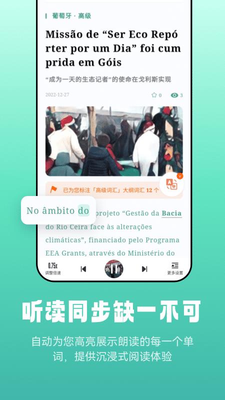 莱特葡萄牙语阅读听力app软件作为葡萄牙语阅读听力训练小工具,包含的学习资源丰富,支持边阅读边进行标注,可以自由设定和调节播放的速度,随时可以开始和暂停,对于重点词汇还有全方位的解析。